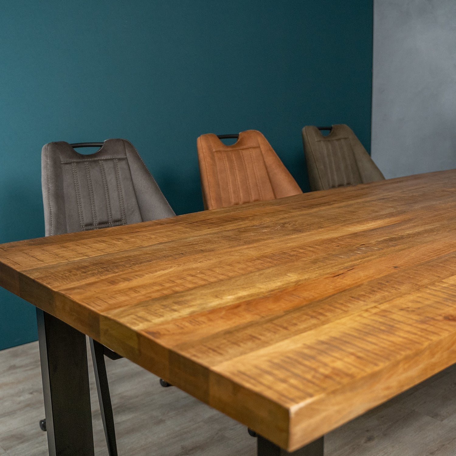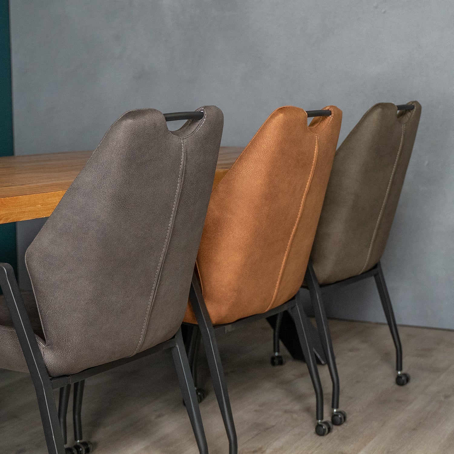 Der Esszimmerstuhl Axe wird aus hochwertiger Mikrofaser hergestellt und ist in drei verschiedenen Industriefarben erhältlich. Nämlich in Anthrazit, Cognac und Army Green. Esszimmerstühle aus Mikrofaser sind leicht zu reinigen und werden durch eine Behandlung mit unserem Textilimprägnierspray noch besser geschützt.