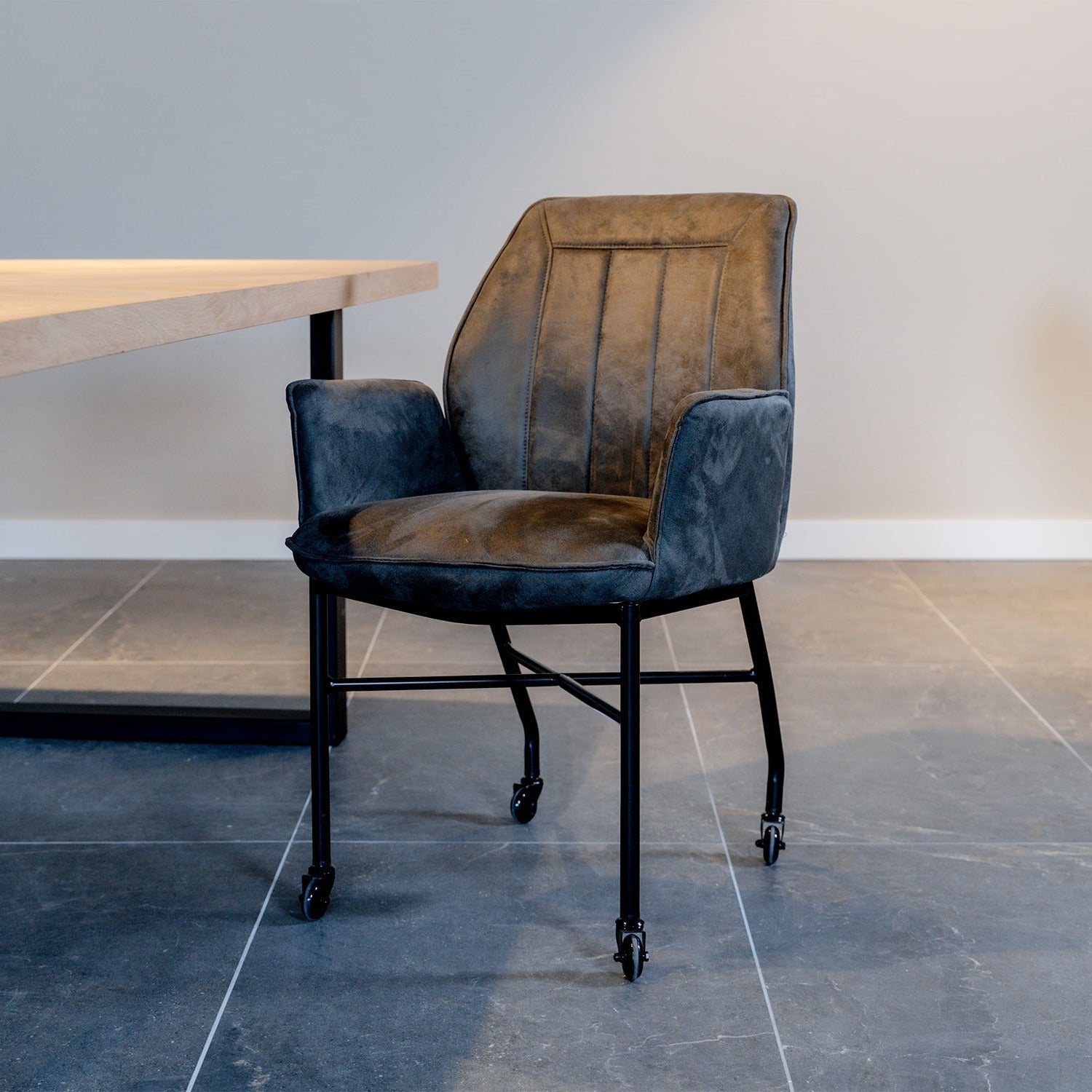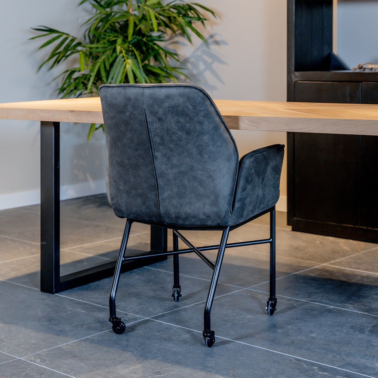 Die Rollen an der Unterseite des Stuhls ermöglichen ein einfaches Hinein- und Herausschieben am Esstisch, was nicht nur bei den Mahlzeiten, sondern auch bei Besprechungen oder in geselliger Runde praktisch ist. Die stabile Konstruktion und die robuste Rückenlehne sorgen für Langlebigkeit und Komfort, so dass Sie stundenlang unbesorgt sitzen können. Die Armlehne verleiht dem Design einen Hauch von Eleganz und bietet eine gute Unterstützung, so dass er die perfekte Wahl zum Entspannen und Essen ist. Dieser Esszimmerstuhl auf Rollen bietet das Beste aus zwei Welten: praktische Bequemlichkeit und soliden Komfort, der Ihr Esszimmer nicht nur funktional, sondern auch stilvoll macht.