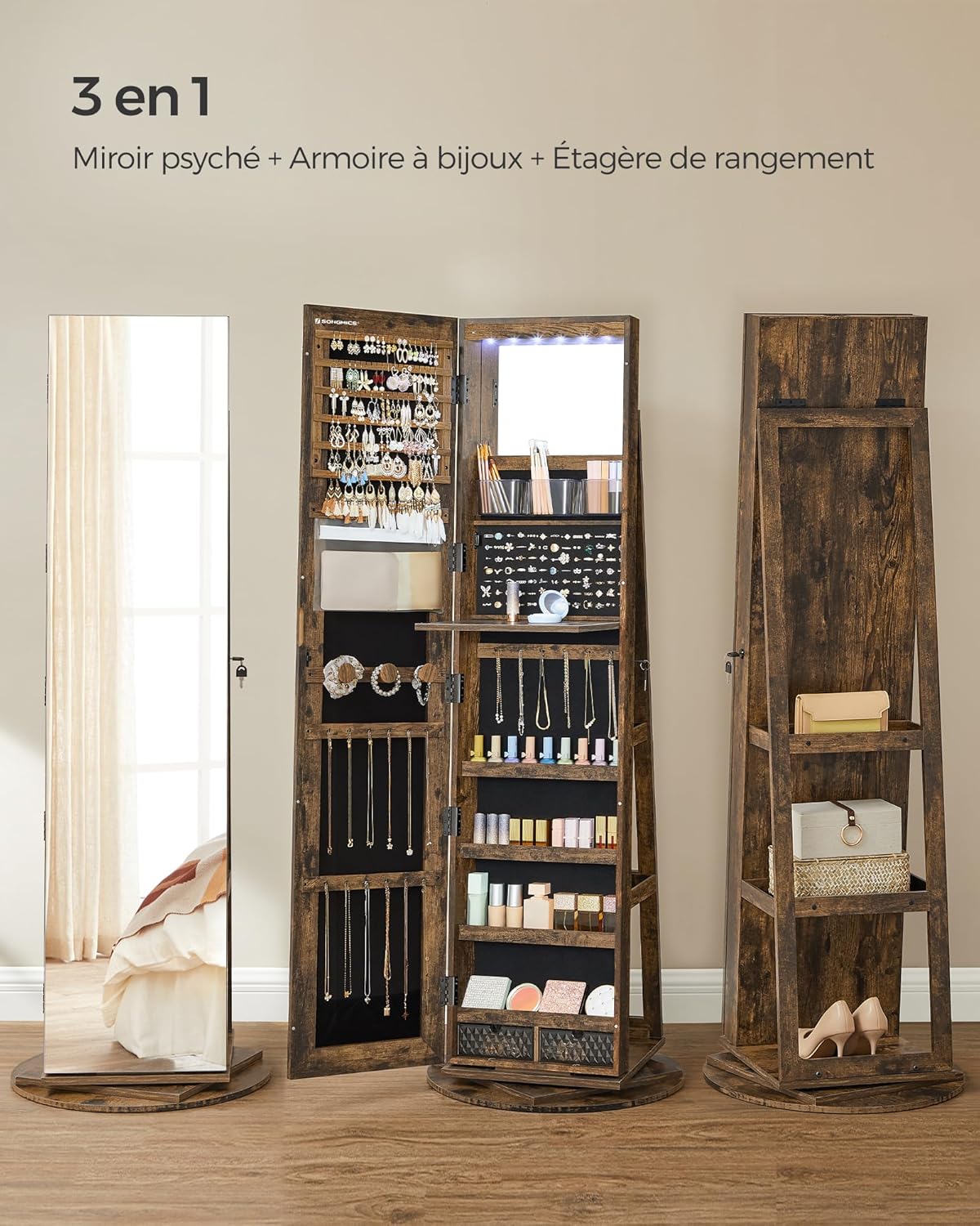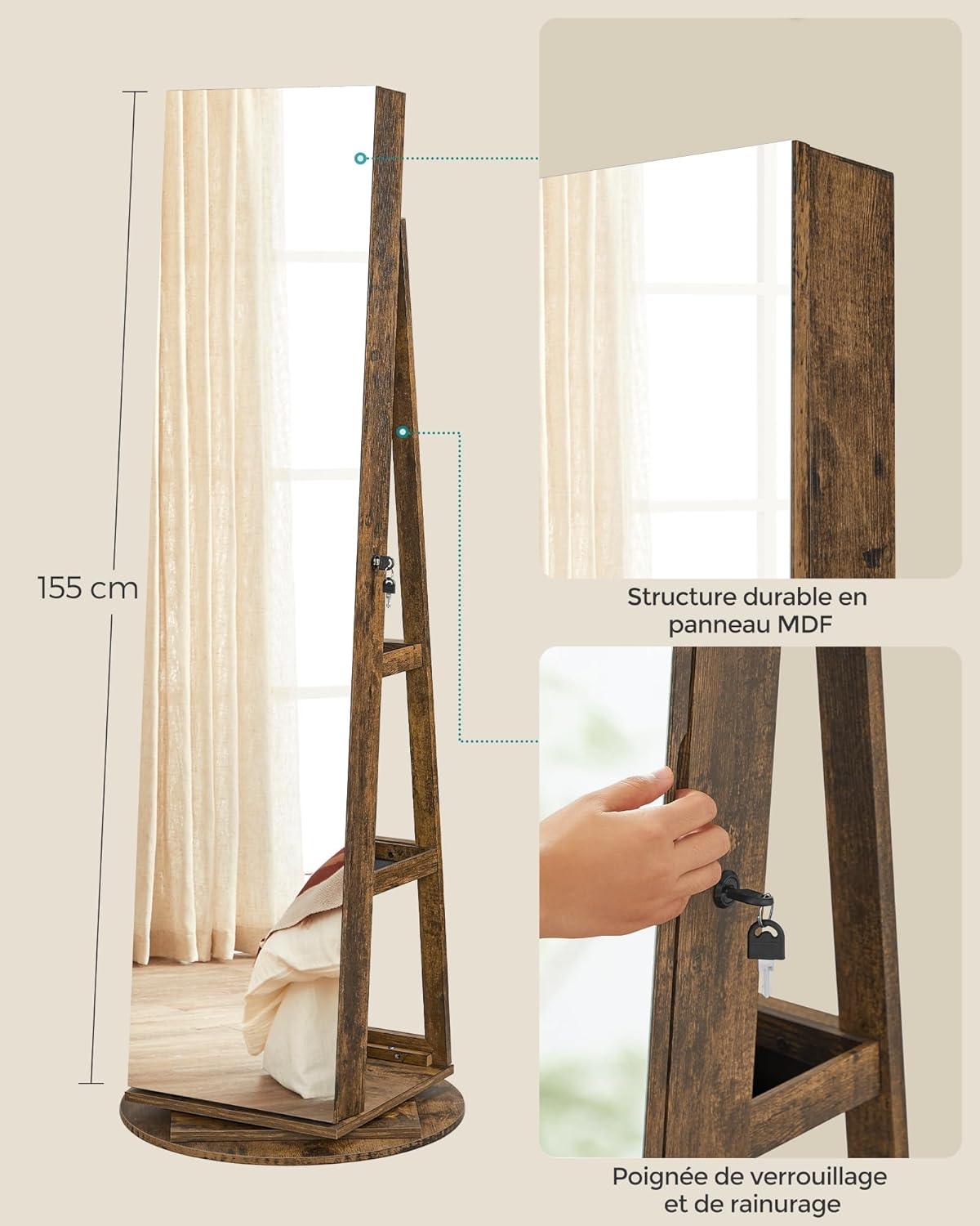 Vous cherchez un miroir ? Celui-ci est bien plus que cela. Un miroir sans cadre sur toute la longueur rencontre un organisateur de bijoux spacieux et verrouillable, vous offrant à la fois fonction et style.